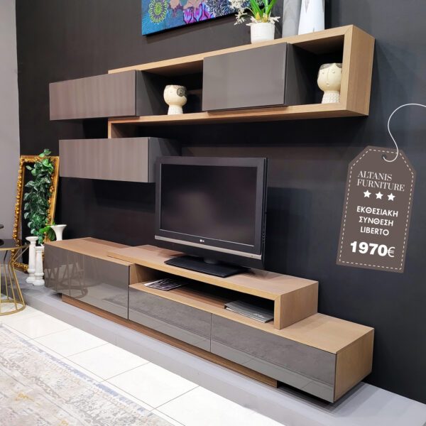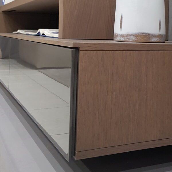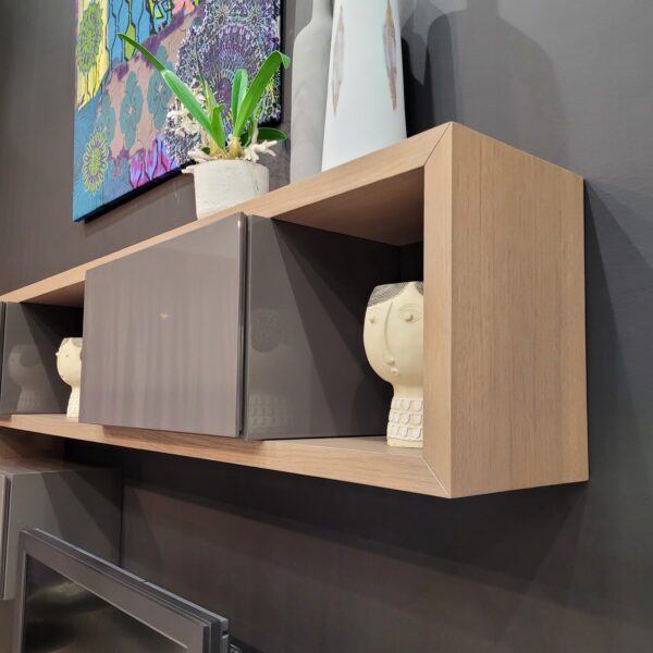 Ξύλο δρυ και λάκα σε ένα μοντέρνο σύνολο που θα μεταμορφώσει κάθε χώρο. Διάσταση 2,80μ με έξυπνο μεγάλο αποθηκευτικό χώρο (ντουλάπια, ράφια, ανοίγματα). Elegant σχεδιαστικά κοψίματα και κρεμαστά στοιχεία που δεν φορτώνουν τον χώρο