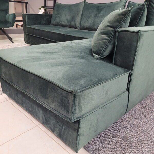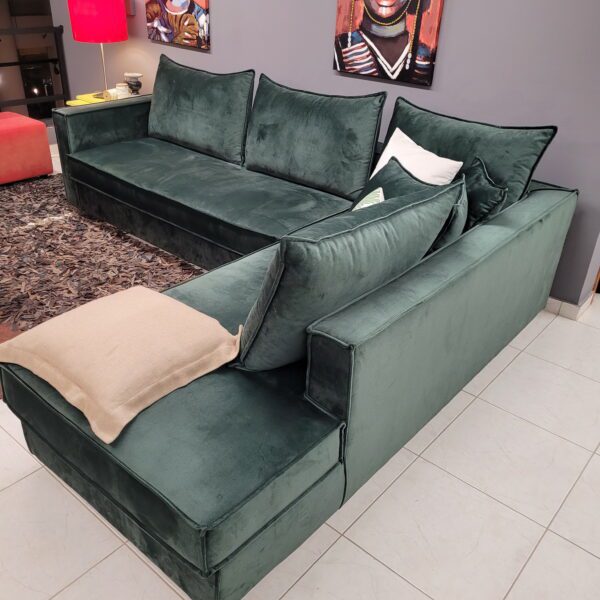 Διάσταση 2,80μ X 2,20μ Χ 90cm. Σκελετός από οξιά με αδιάβροχο/αλέκιαστο βελούδο ύφασμα. Τα μαξιλάρια είναι αποσπώμενα και αφαιρείται το ύφασμα. Ο σκελετός του καναπέ είναι επισκέψιμος (φερμουάρ στο κάτω μέρος). Μαλακός και εξαιρετικά αναπαυτικός για πολλές ώρες χαλάρωσης.